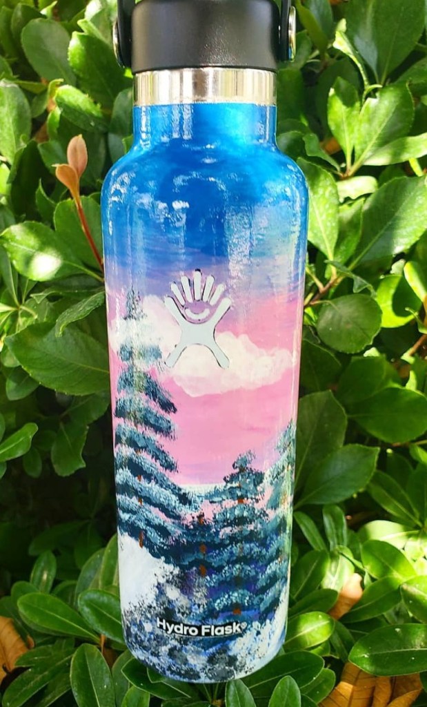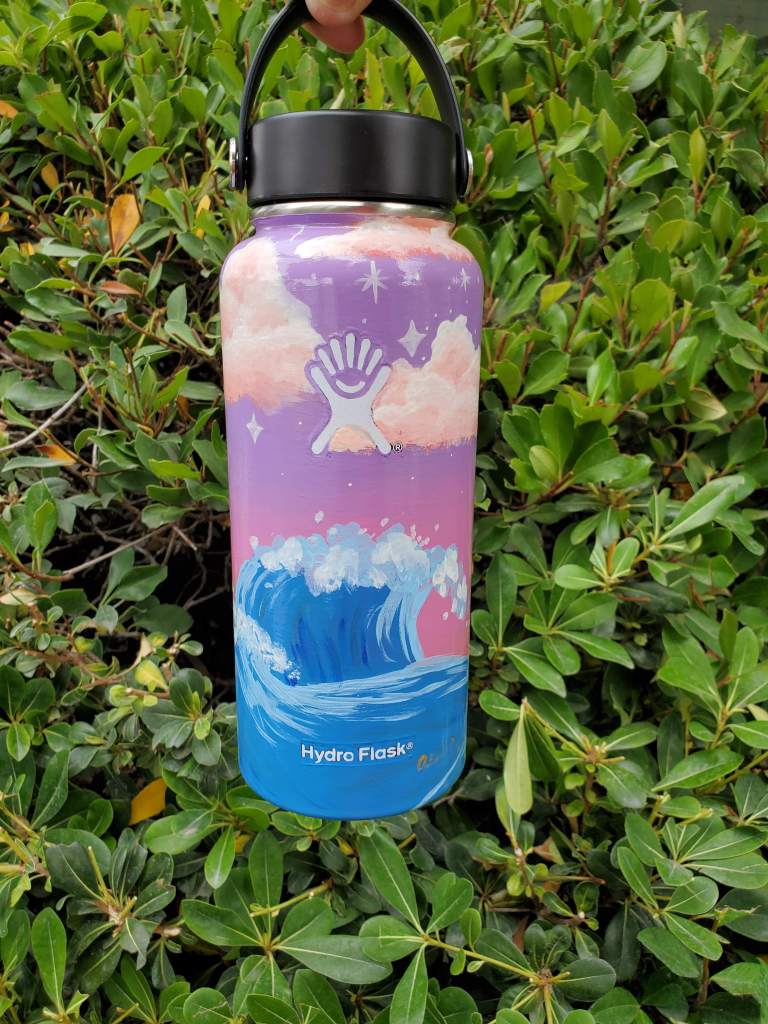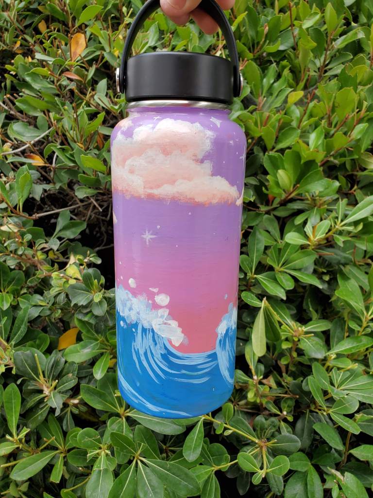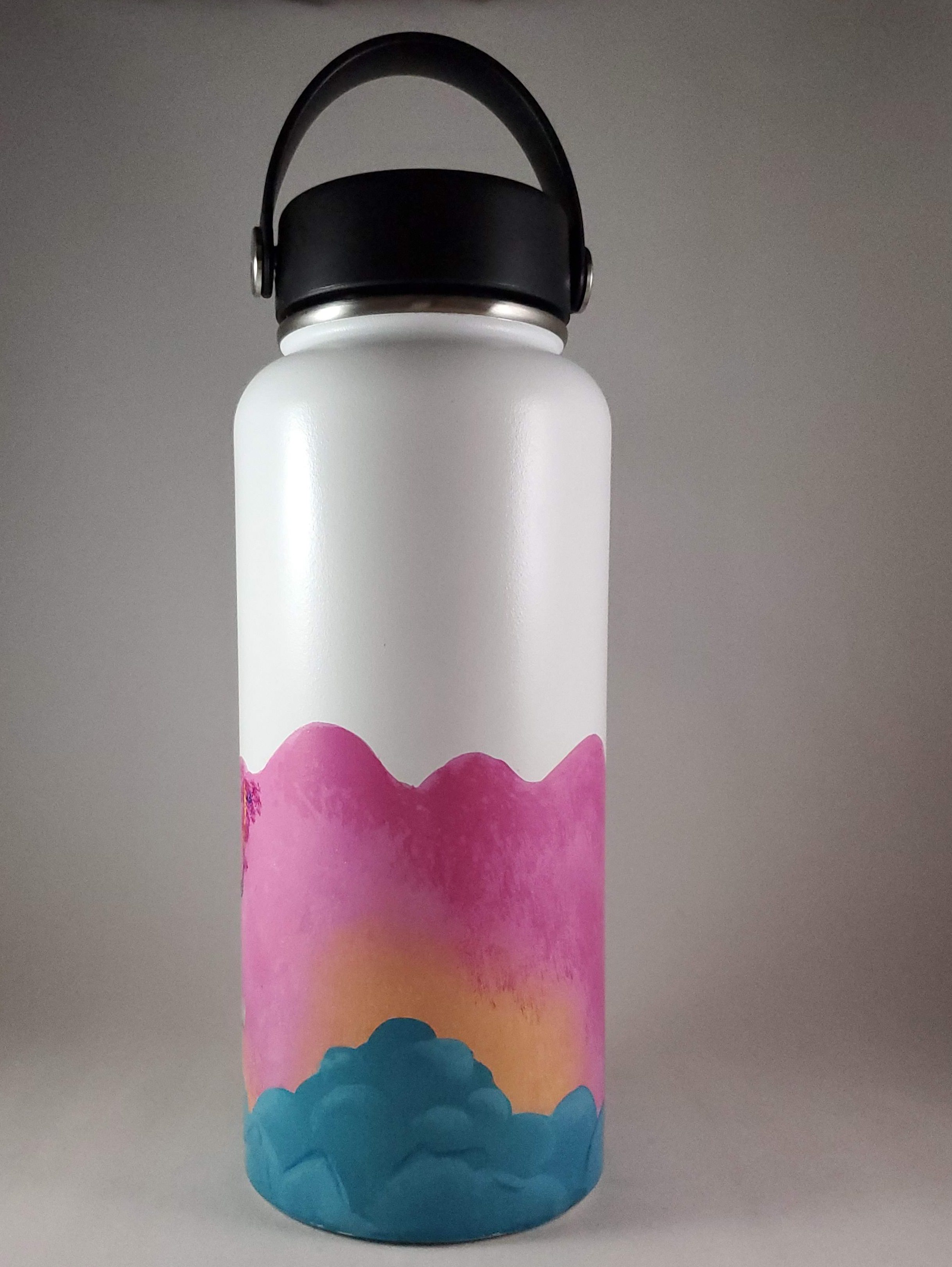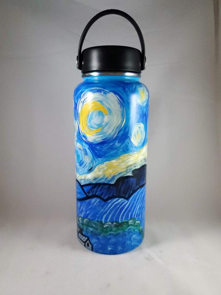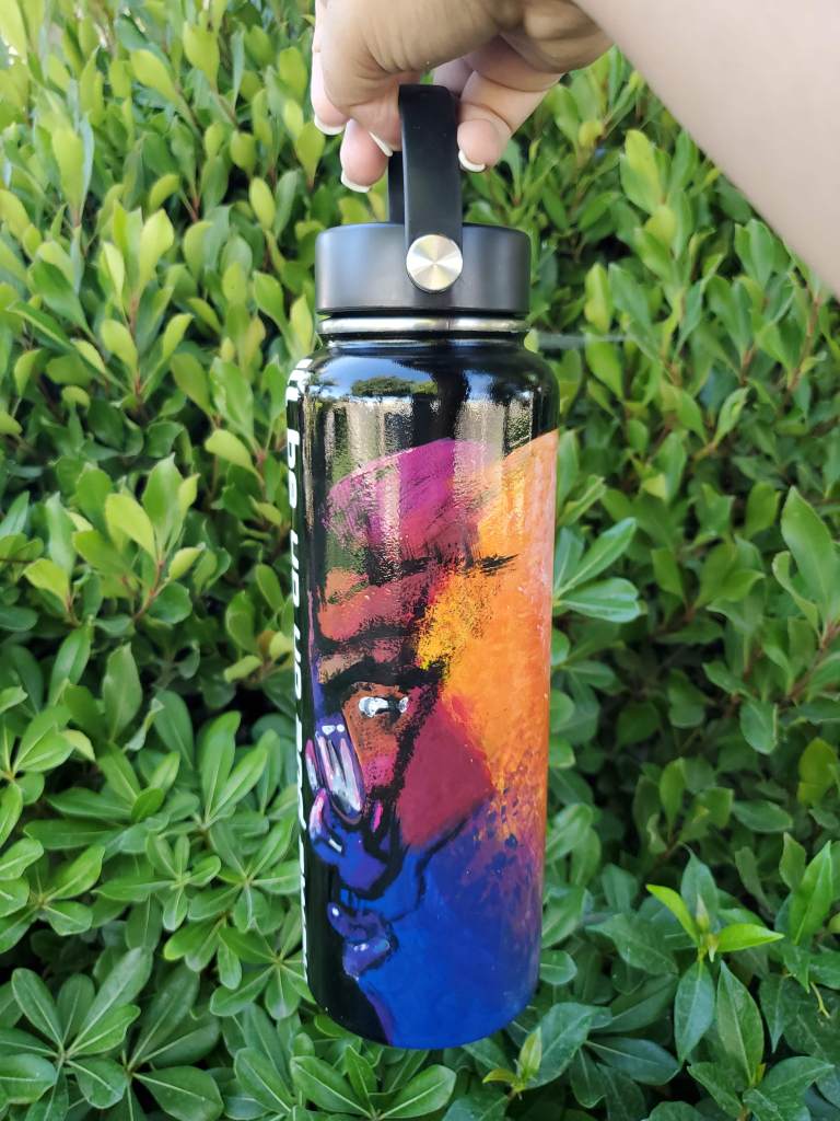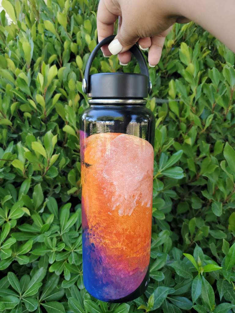 Each painted bottle is uniquely hand painted on a high quality re-usable water bottle to the customer’s request. Acrylic paint is carefully used to bring the design to life and a food safe resin is applied and cured to ensure that no damage comes to the painting. The resin coating also provides an additional layer of protection to the bottle’s original integrity. Contact to Order.