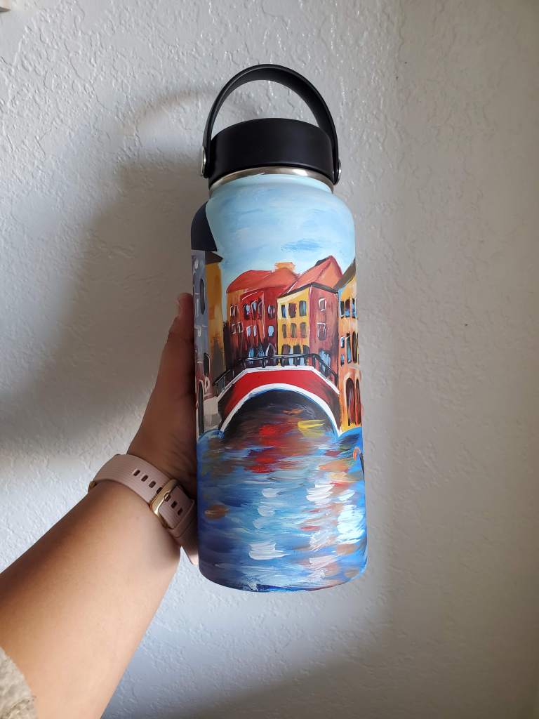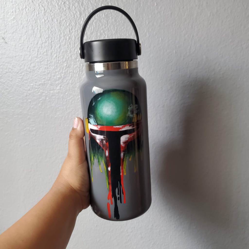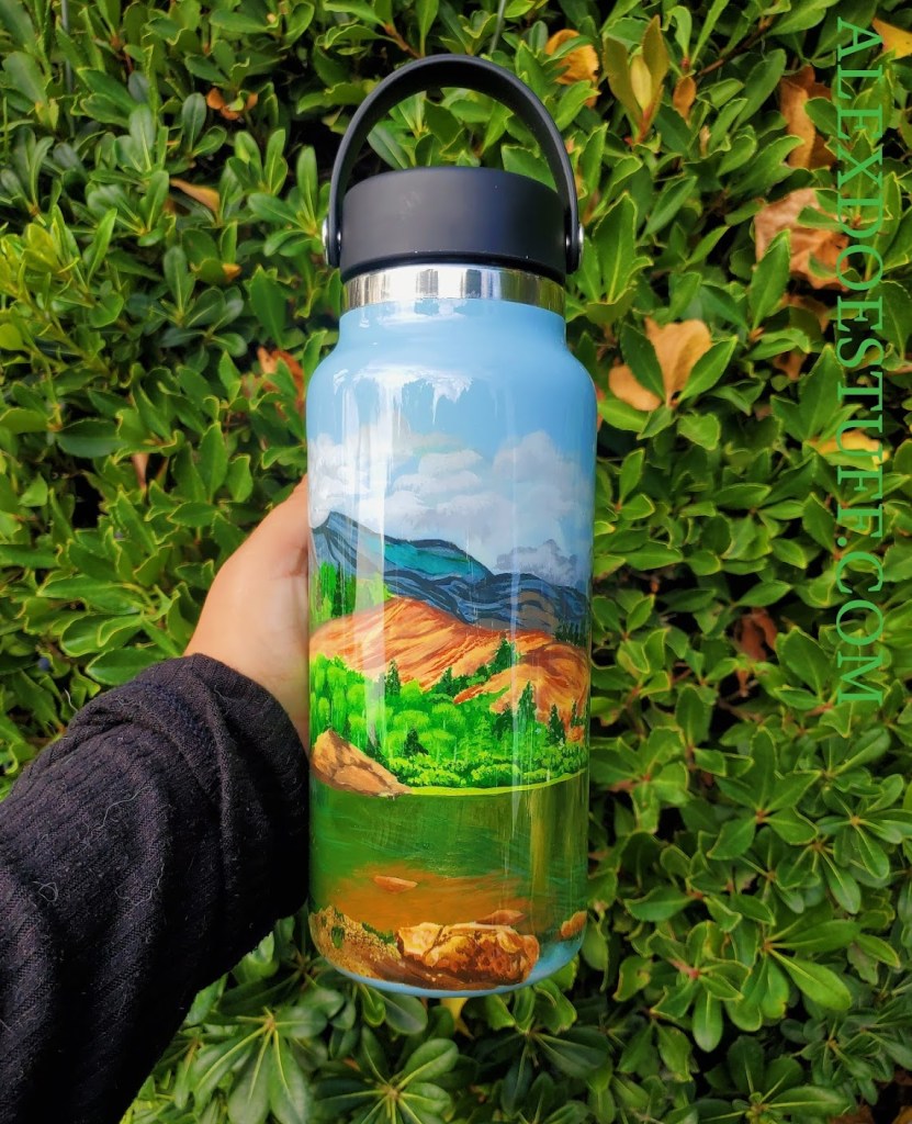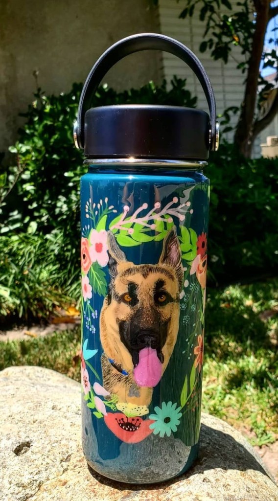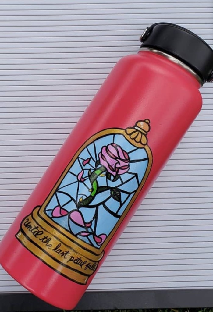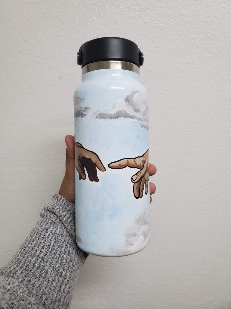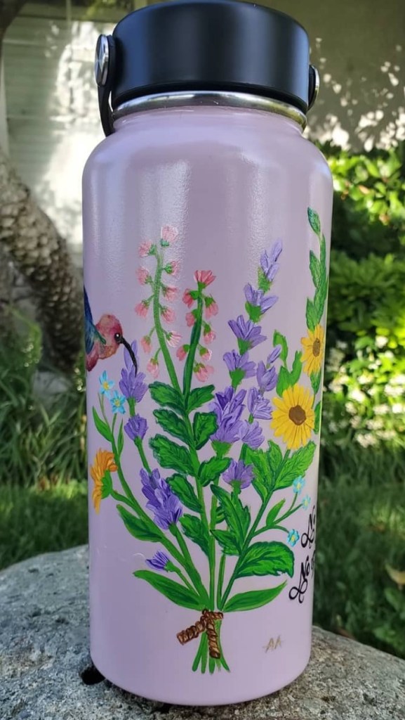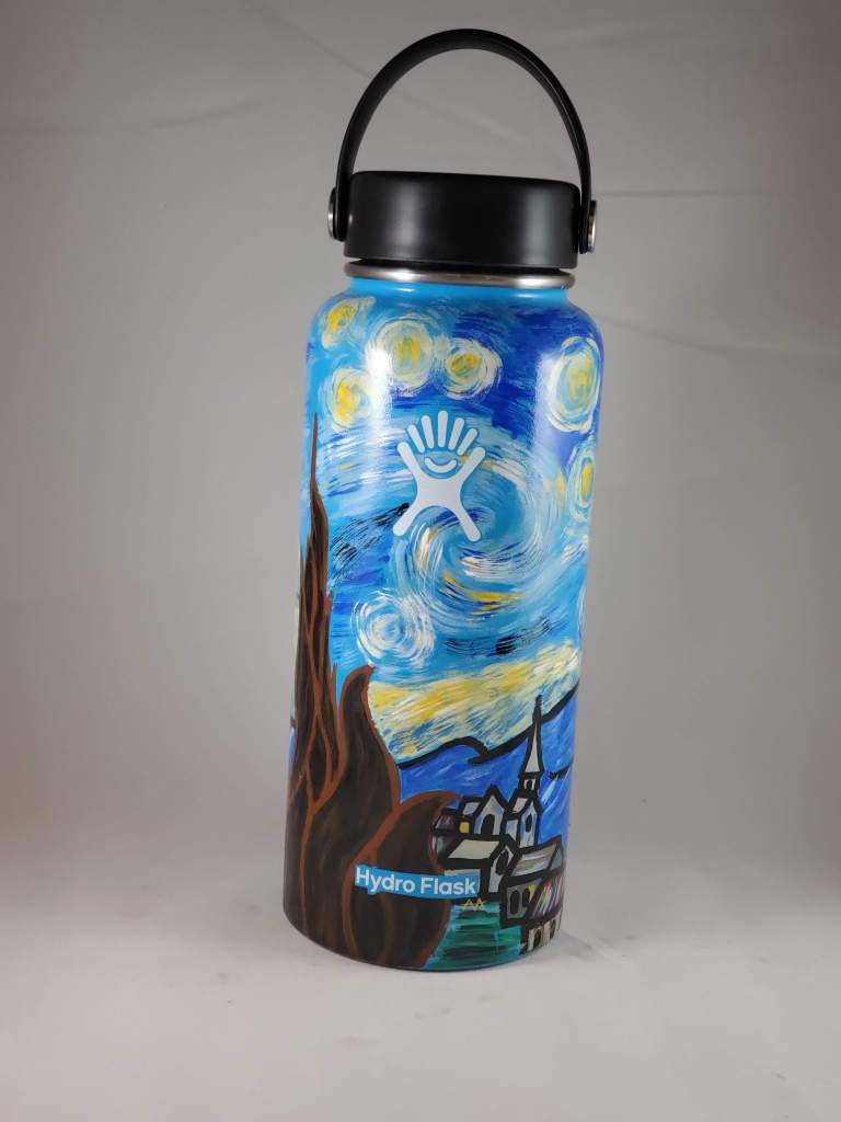 Each painted bottle is uniquely hand painted on a high quality re-usable water bottle to the customer’s request. Acrylic paint is carefully used to bring the design to life and a food safe resin is applied and cured to ensure that no damage comes to the painting. The resin coating also provides an additional layer of protection to the bottle’s original integrity. Contact to Order.