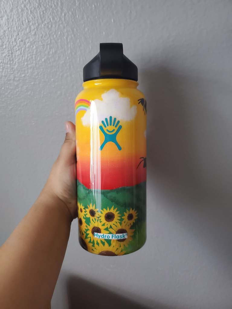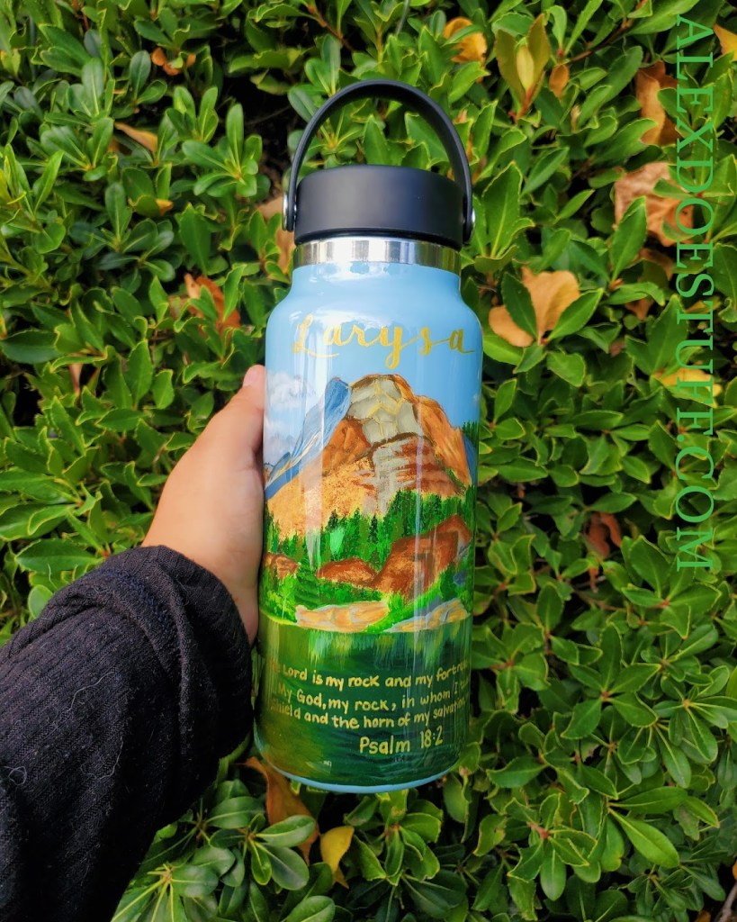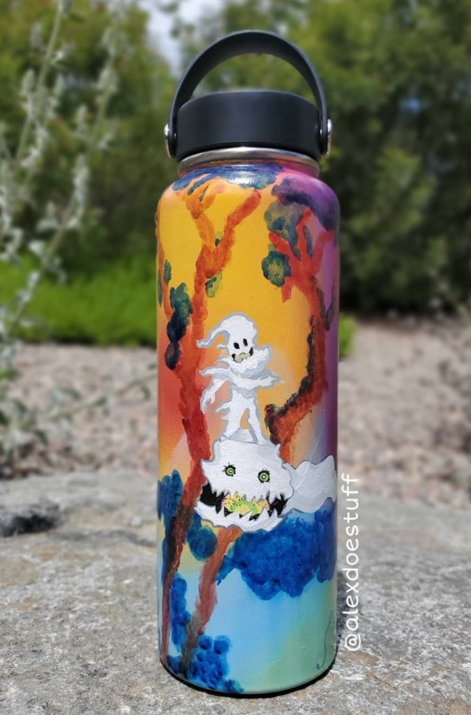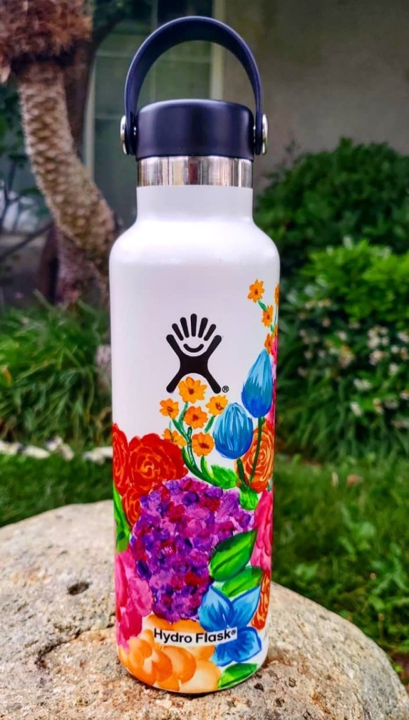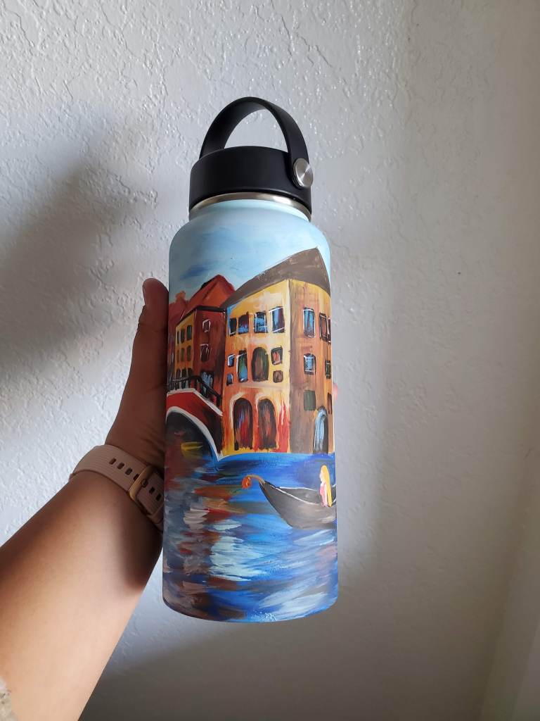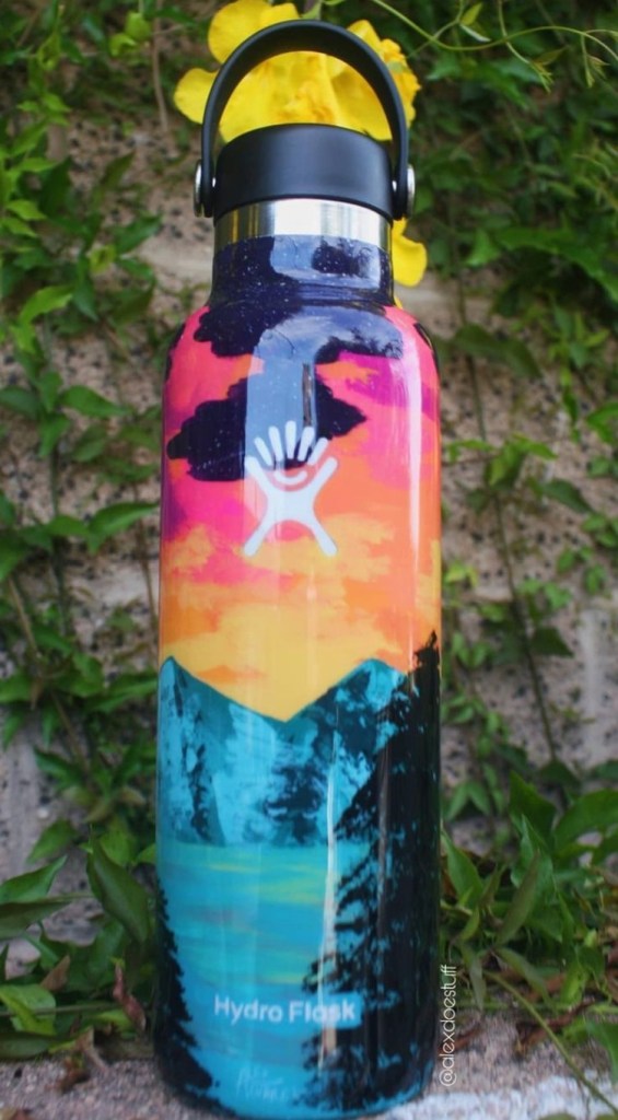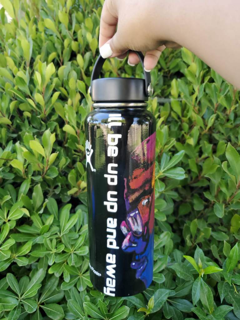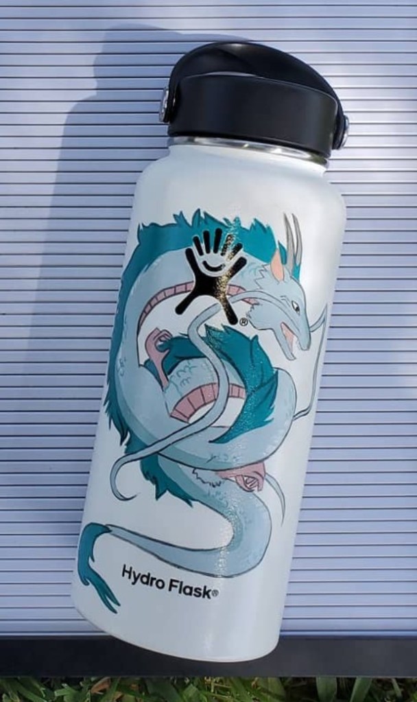 Each painted bottle is uniquely hand painted on a high quality re-usable water bottle to the customer’s request. Acrylic paint is carefully used to bring the design to life and a food safe resin is applied and cured to ensure that no damage comes to the painting. The resin coating also provides an additional layer of protection to the bottle’s original integrity. Contact to Order.