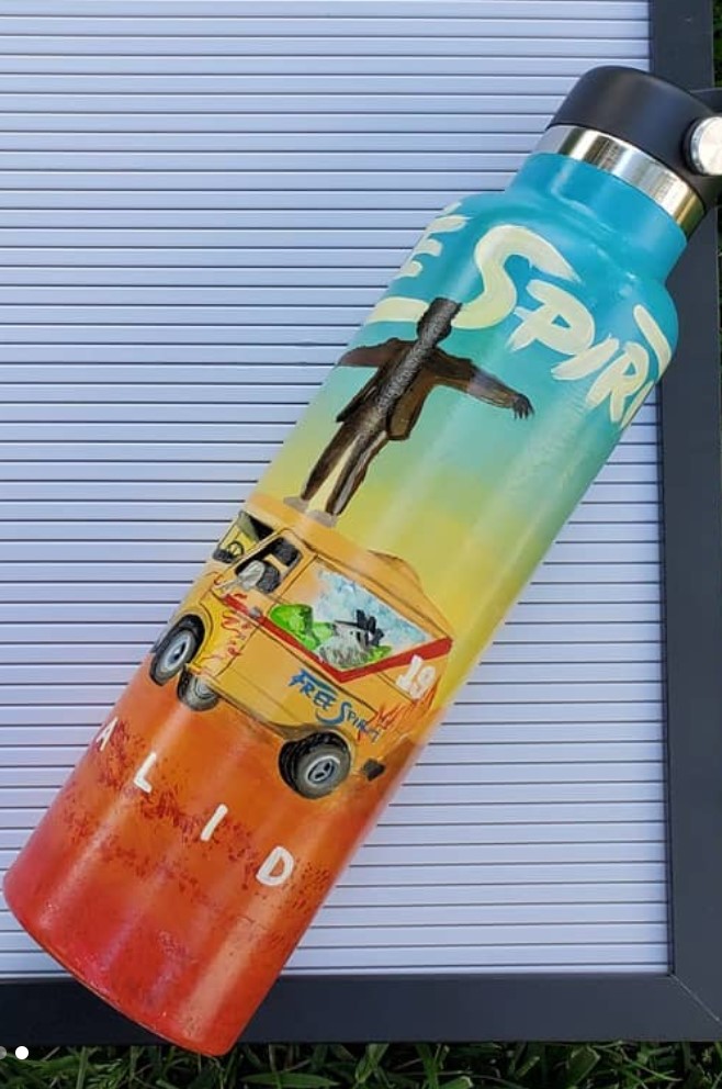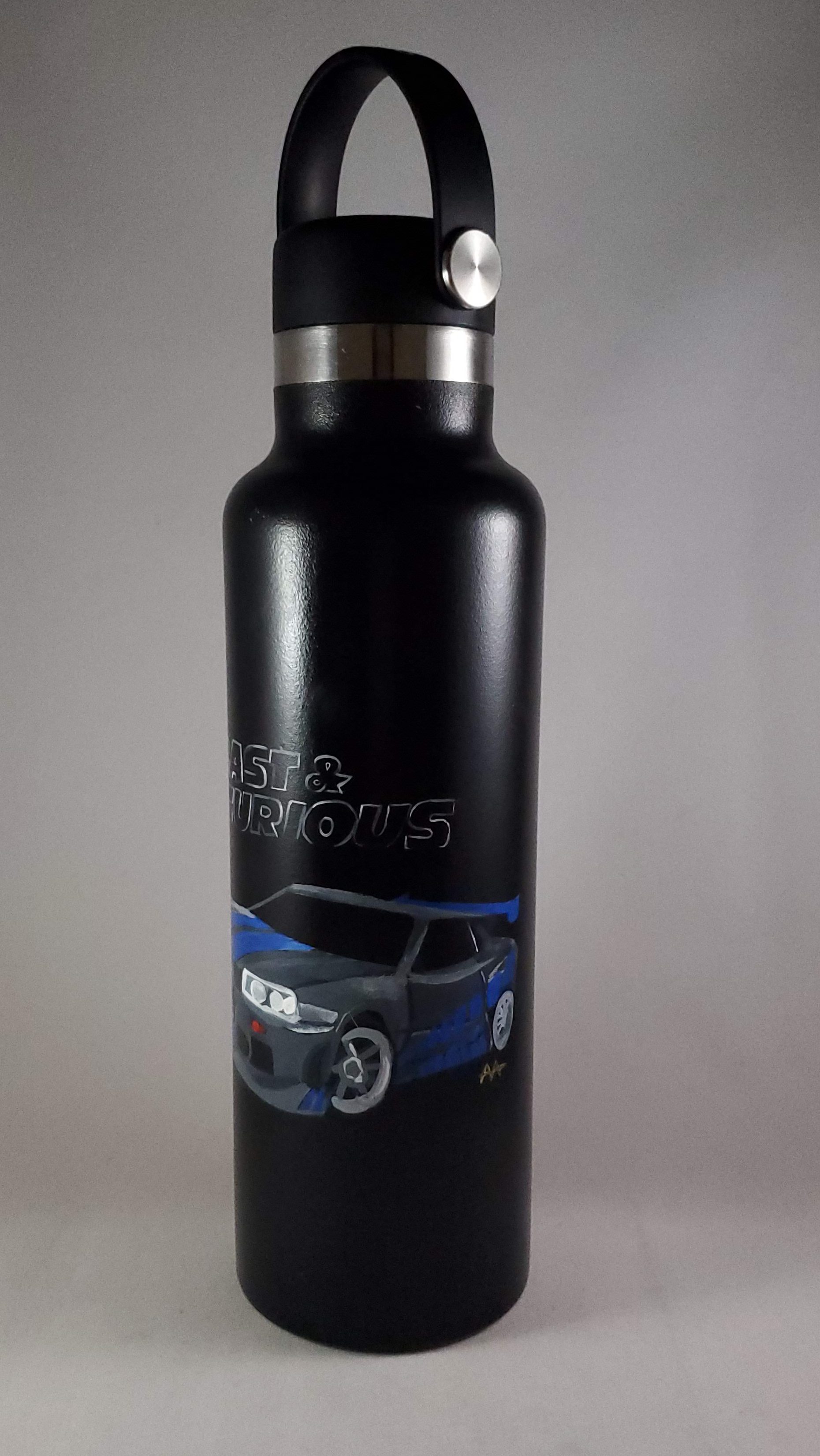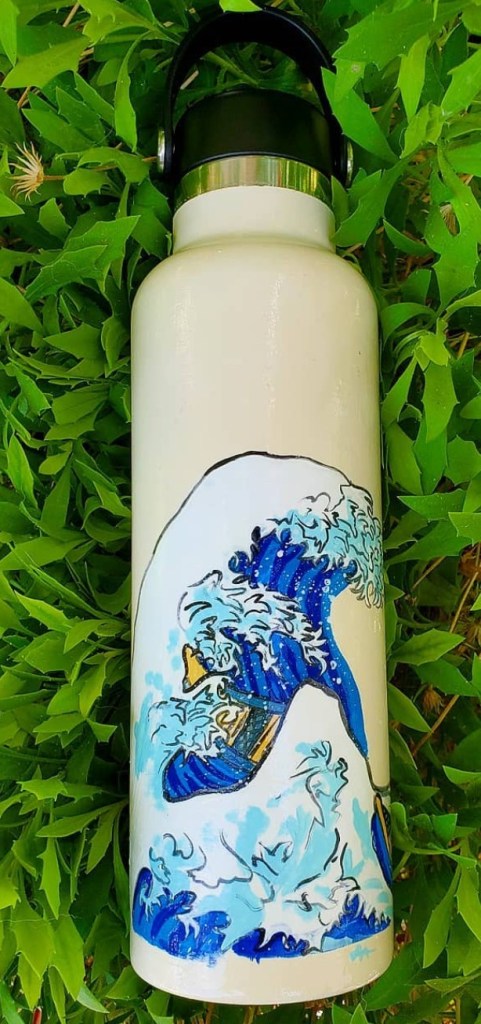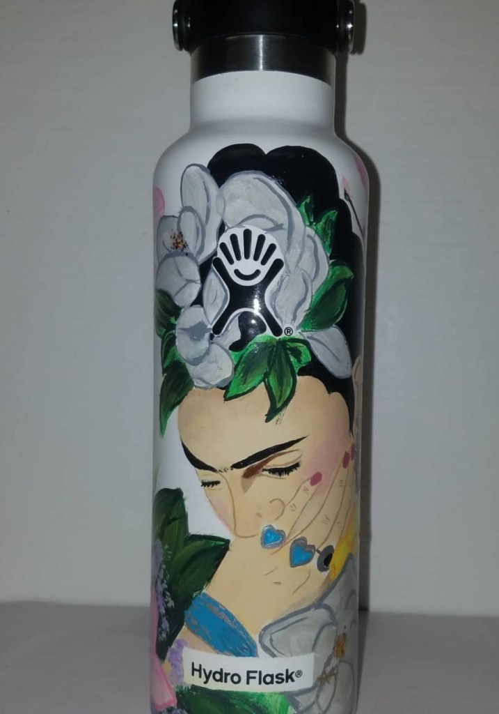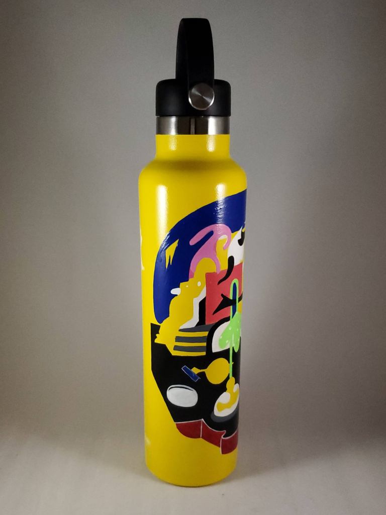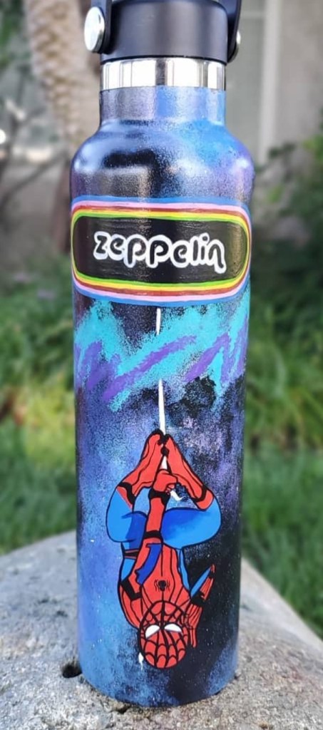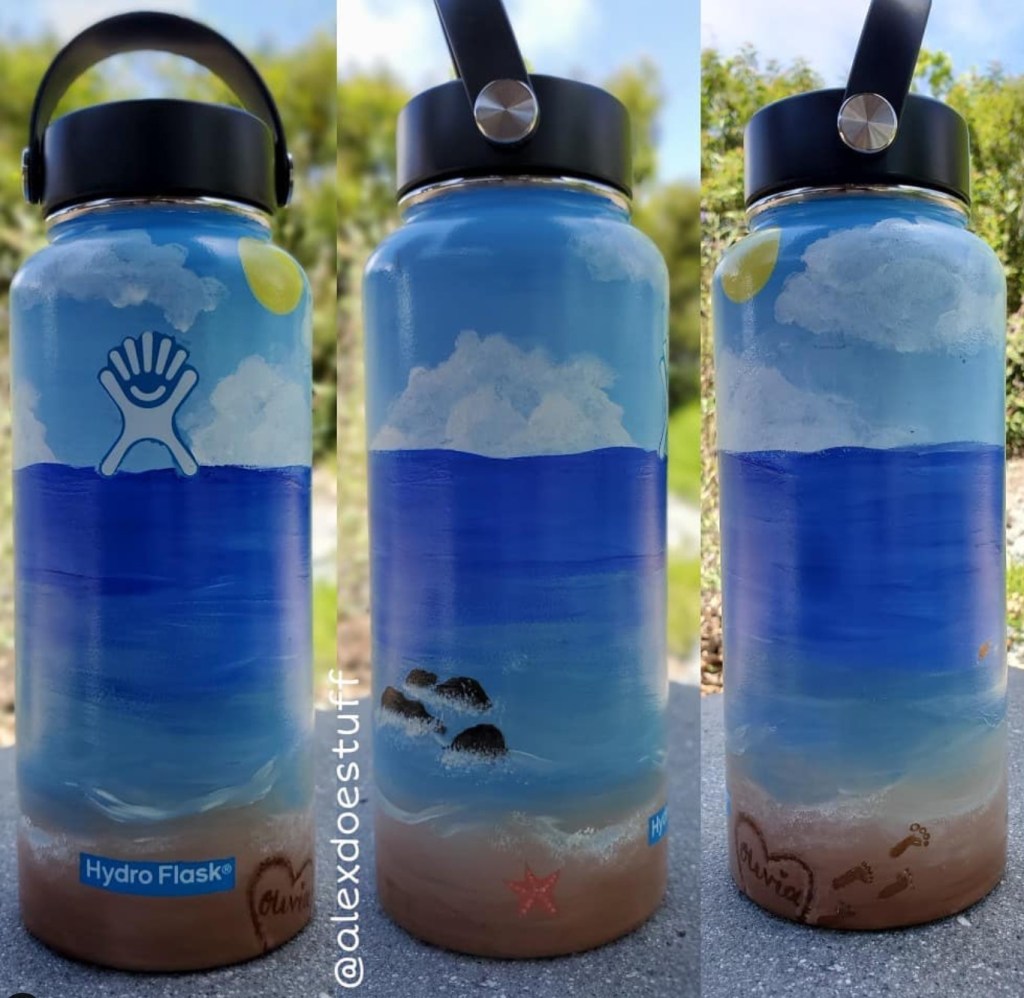 Each painted bottle is uniquely hand painted on a high quality re-usable water bottle to the customer’s request. Acrylic paint is carefully used to bring the design to life and a food safe resin is applied and cured to ensure that no damage comes to the painting. The resin coating also provides an additional layer of protection to the bottle’s original integrity. Contact to Order.