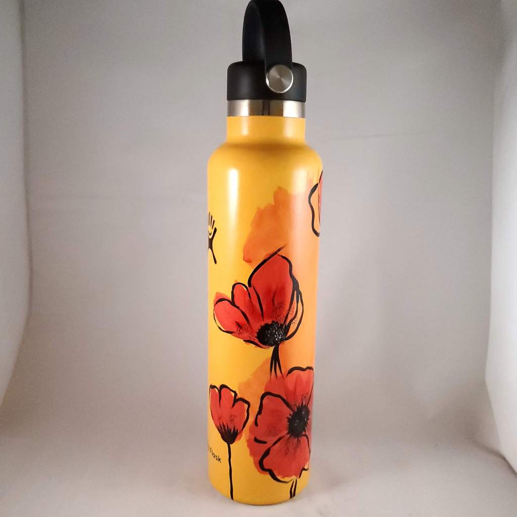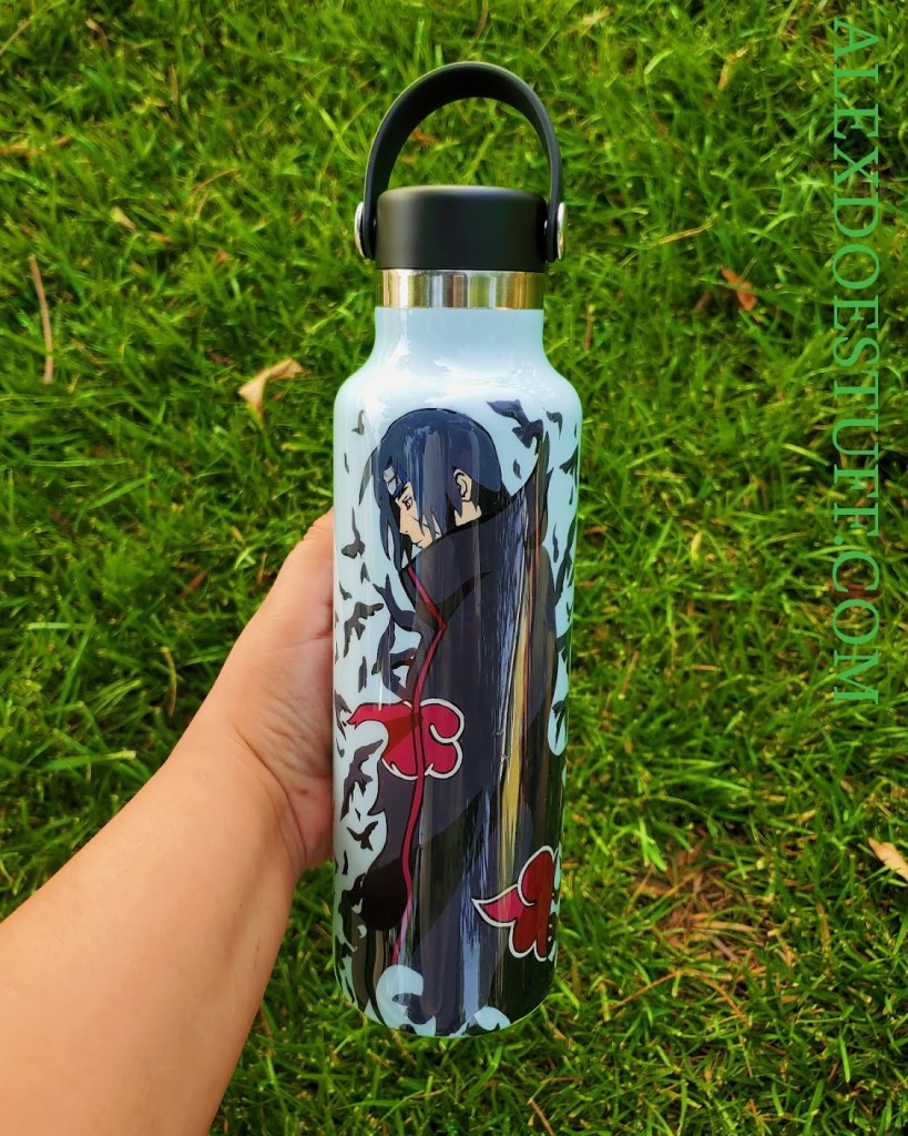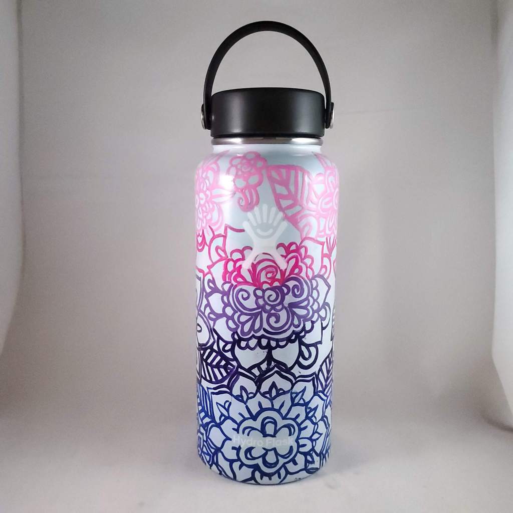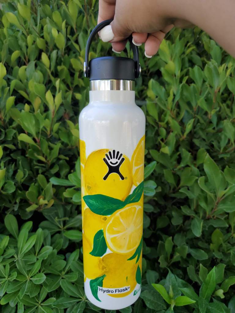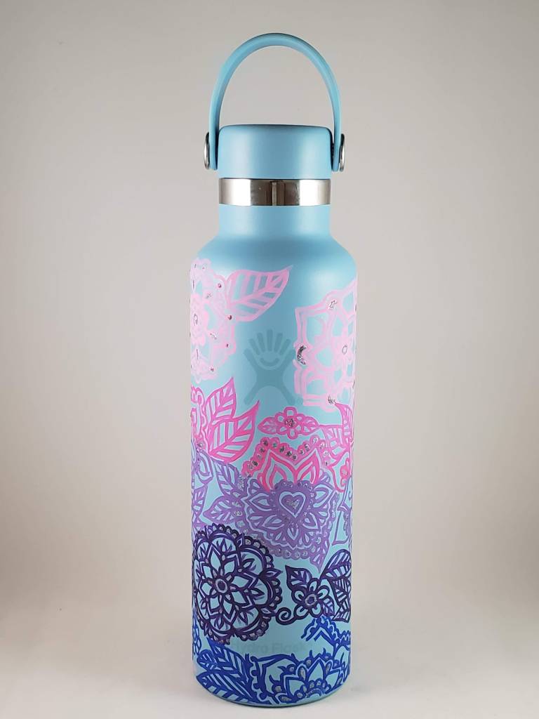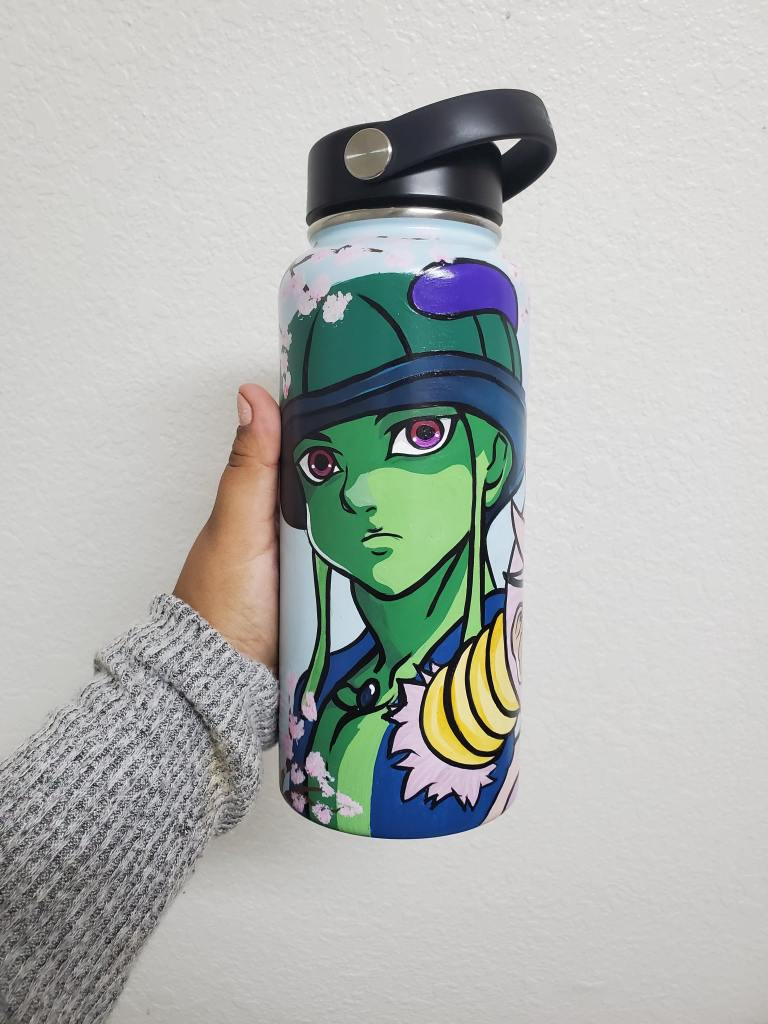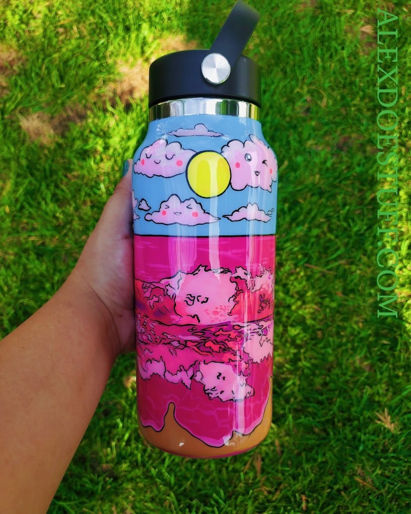 Each painted bottle is uniquely hand painted on a high quality re-usable water bottle to the customer’s request. Acrylic paint is carefully used to bring the design to life and a food safe resin is applied and cured to ensure that no damage comes to the painting. The resin coating also provides an additional layer of protection to the bottle’s original integrity. Contact to Order.